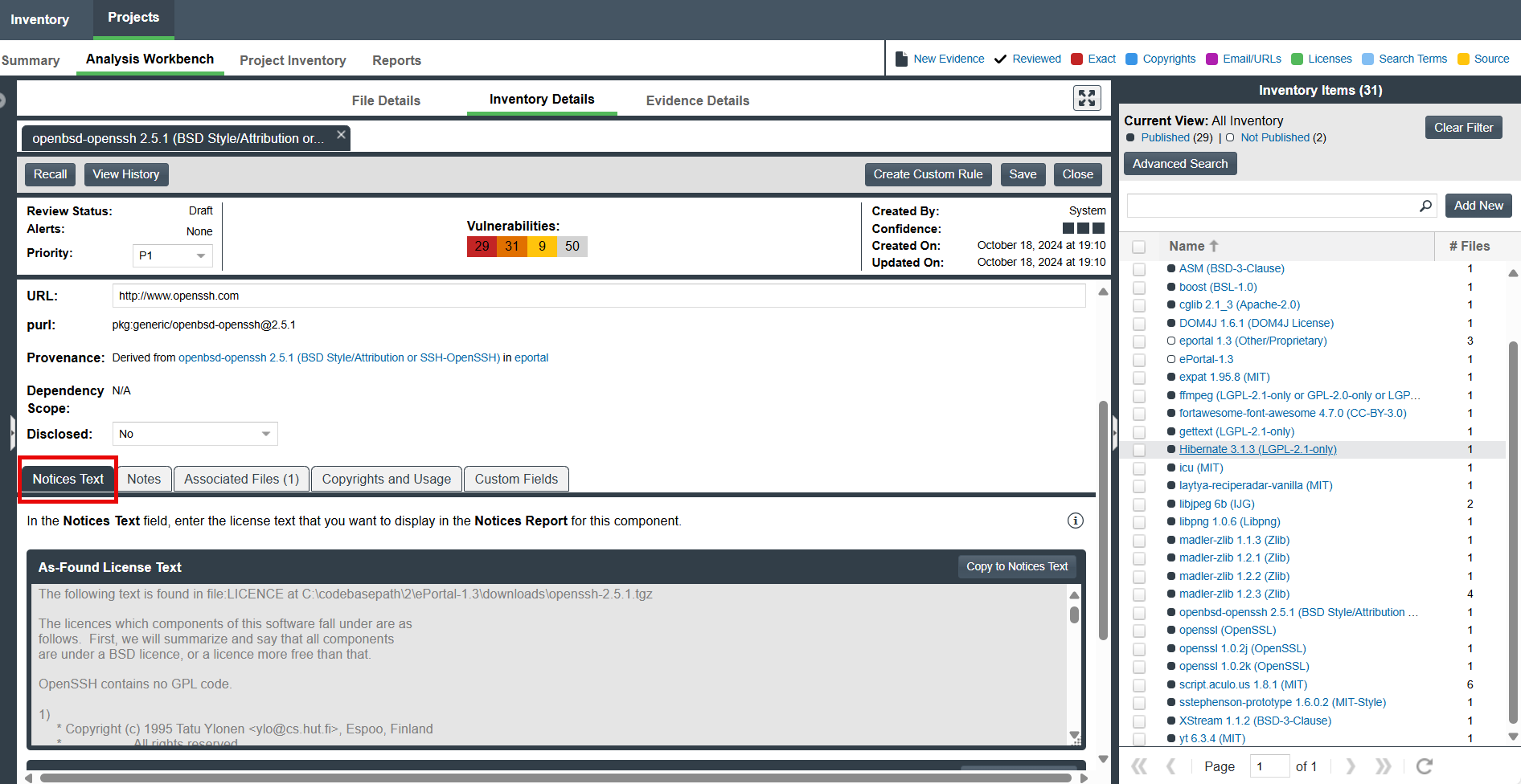 In the Analysis Workbench, on the Inventory Details tab for a specific inventory item, open the Notices Text tab. If necessary, see Opening the Analysis Workbench.