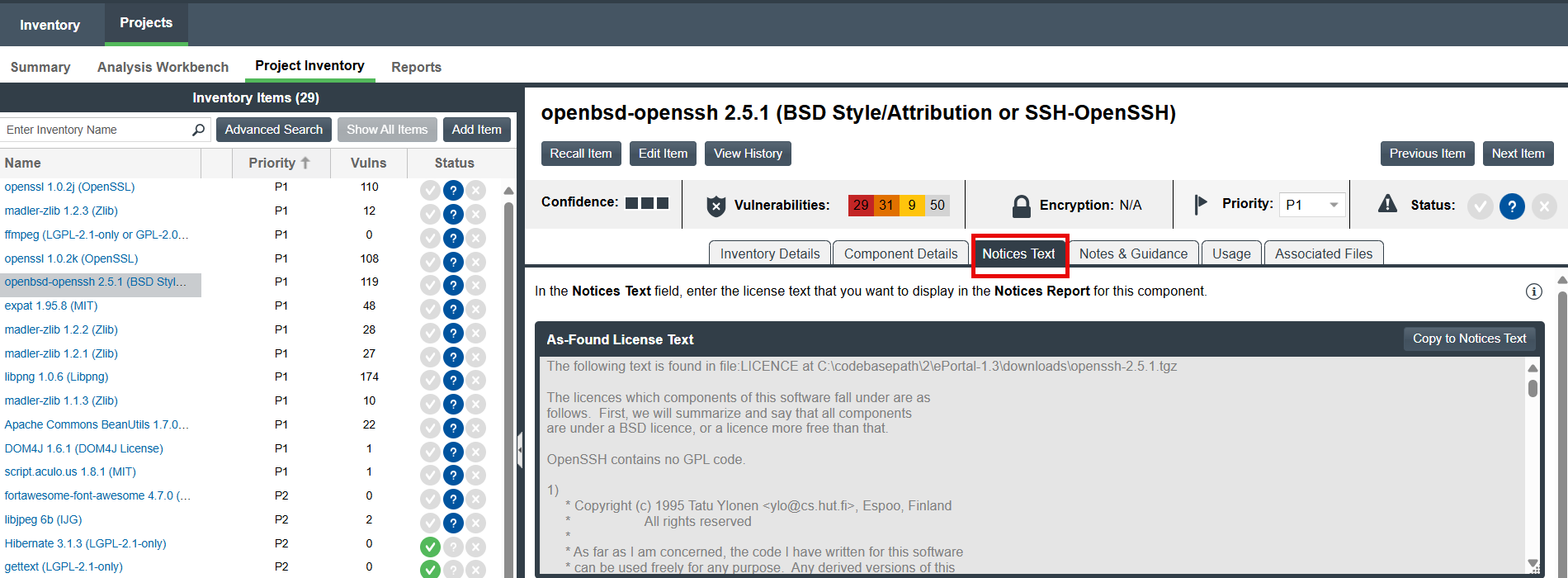 In the Notices Text tab for the inventory item, click the Copy to Notices Text button in the top right corner of the As-Found License Text field.