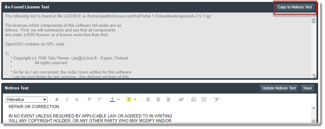 If As-Found License Text content exists and you want to use a modified version of it in the Notices report or you want to use this content to replace or add to text already in the Notices Text field, you must copy the As-Found License Text content to the Notices Text field.
